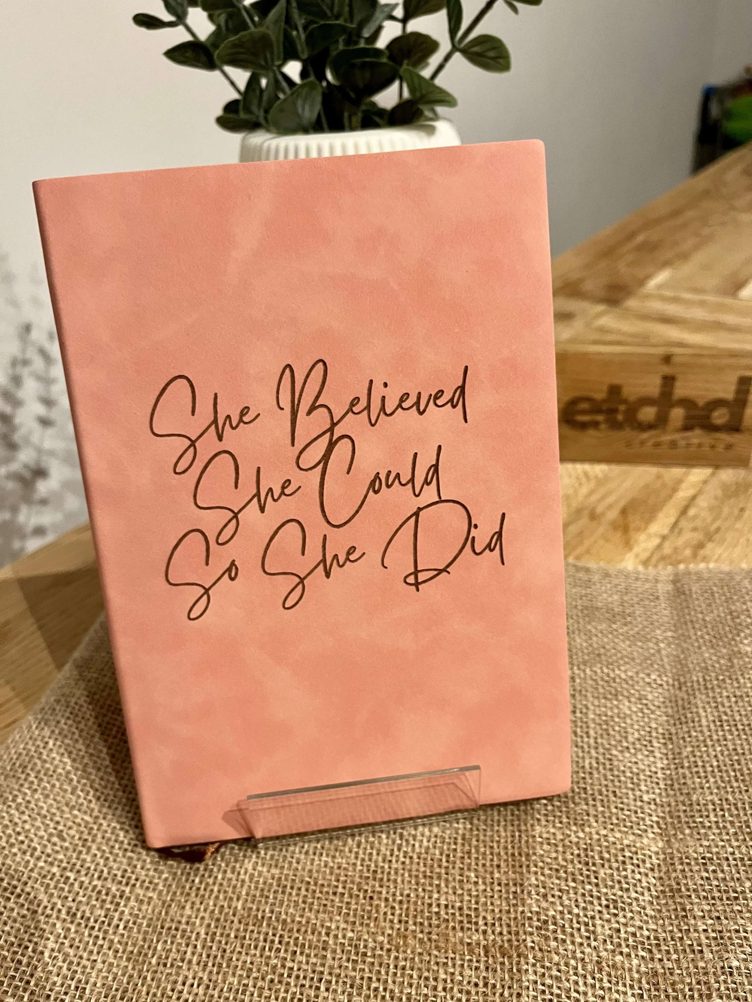 Beautiful A5 soft faux leather Notebook/journal - laser engraved with the choice of three pre-made designs or the option to customise with personal a quote, passage or phrase. Inside includes: